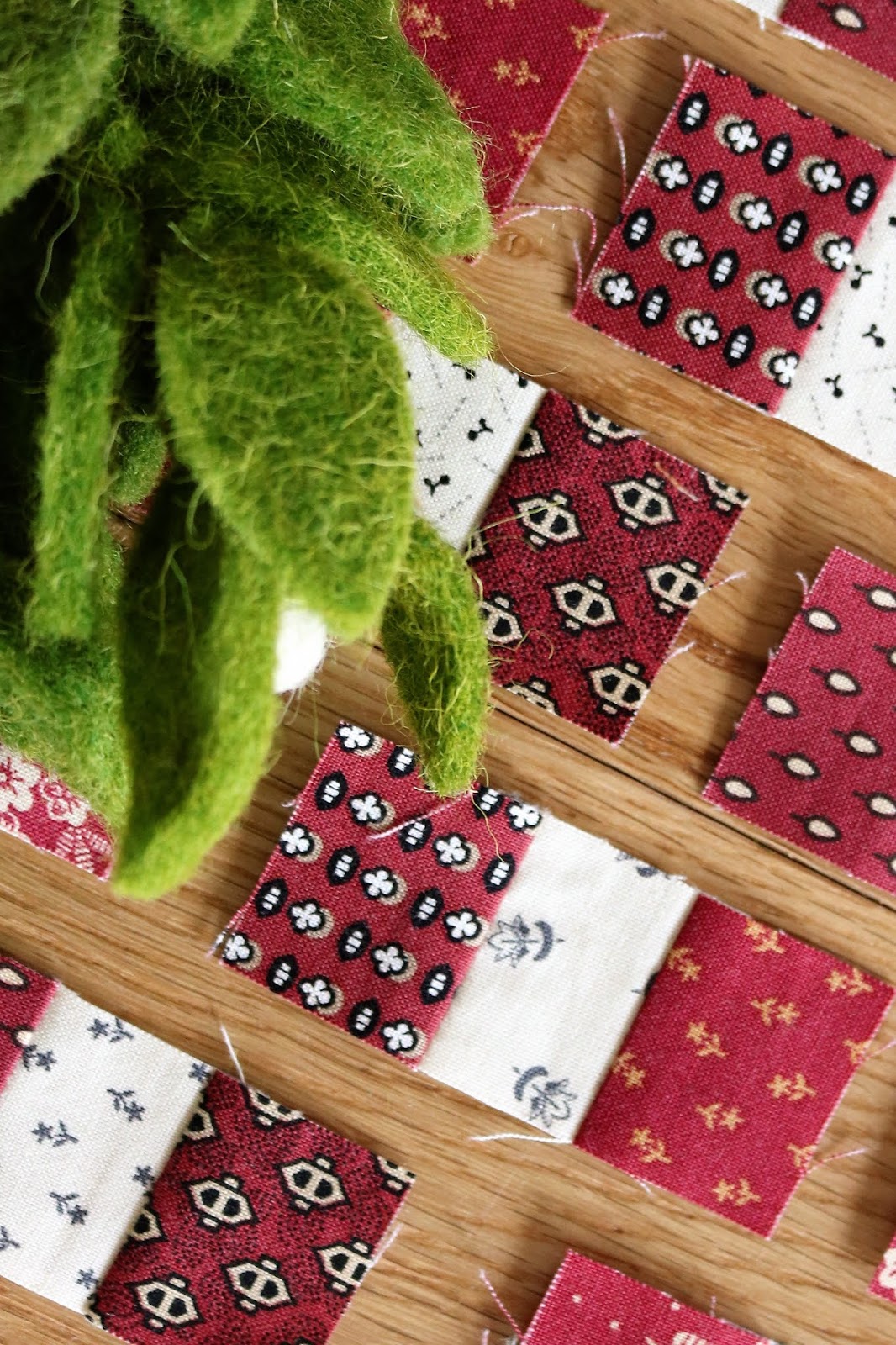 Using 17 light strips, 1-1/4" x 11" and 34 red strips, 1-1/4" x 11"